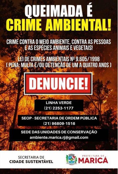 A Secretaria de Cidade Sustentável de Maricá está lançando uma campanha visando reduzir possíveis crimes ambientais no município, principalmente das queimadas, que ocorrem com maior frequência no período de tempo seco, onde uma ponta de cigarro pode dar início ao fogo. Para alertar a população sobre o perigo, equipes da pasta têm fixado cartazes em locais da cidade de maior movimento.