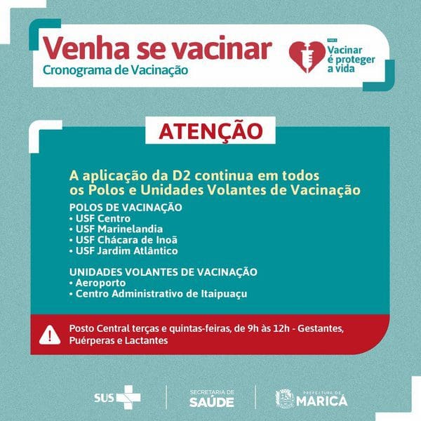 A vacinação ocorreu na unidade Estratégia de Saúde da Família (ESF – Centro) e nas unidades volantes no Aeroporto Municipal, em Araçatiba, e Centro Administrativo de Itaipuaçu.