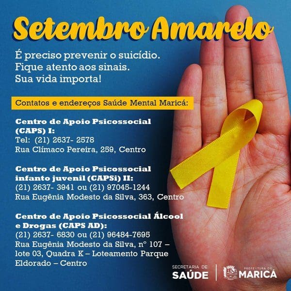 Em 2021, o Setembro Amarelo – campanha nacional de valorização da vida (10 de setembro é o Dia Mundial de Prevenção ao Suicídio) – em Maricá ganhou reforços. A Secretaria Municipal de Saúde de Maricá, através da coordenação de Atenção Primária e Saúde Mental, ampliou os atendimentos na assistência em Saúde Mental com a implantação de quatro equipes multiprofissionais especializadas. Elas fazem assistência especializada de pessoas em sofrimento psíquico, e estão atuando nos quatro distritos do município (Ponta Negra, Centro, Inoã e Itaipuaçu).