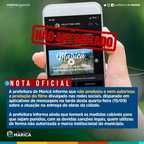 A prefeitura de Maricá informa que não produziu e nem autorizou a produção do filme divulgado nas redes sociais, disparado em aplicativos de mensagens na tarde desta quarta-feira (15/09) sobre a atuação na entrega de obras da cidade.