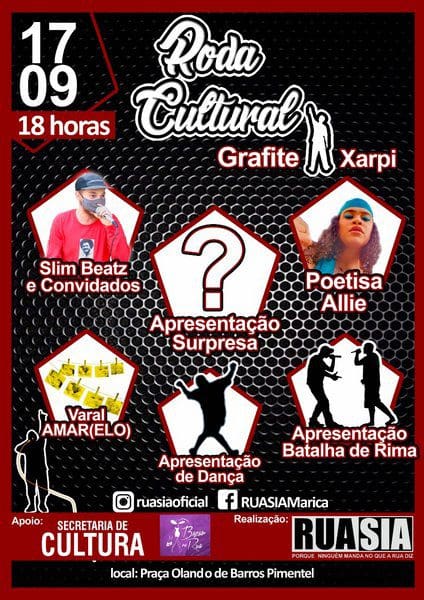As apresentações levarão arte e cultura dos artistas de Maricá para o público, sem limite de idade. A Secretaria de Cultura e o Movimento Cultural Ruasia, à frente do evento, informam que serão quatro horas de muita música, poesia, dança, batalha de rima e outras atividades. Serão vários convidados, entre os quais a poetisa Allie (trans responsável pelo coletivo do LGBT do movimento MPJ), e o Dj Slim Beatz.