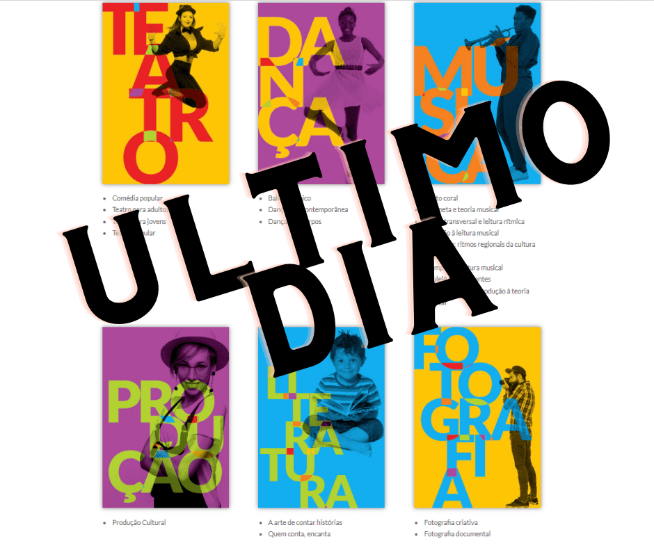 Dentre os cursos oferecidos estão: comédia popular; teatro para jovens; teatro para adultos; teatro popular; balé clássico; dança afro contemporâneas; dança dos corpos; canto coral; clarineta; flauta transversal; iniciação à leitura musical; introdução à teoria musical; percussão; trompete; ukulele para iniciantes; violão; produção cultural; fotografia do cotidiano; fotografia documental; a arte de contar histórias; quem conta, encanta; modos criativos de filmar o real.
