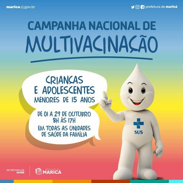 A Prefeitura de Maricá, por meio da Secretaria Municipal de Saúde, realiza neste sábado (16/10) o Dia “D” de Mobilização Nacional da Campanha Nacional de Multivacinação, para atualizar o cartão de crianças e adolescentes menores de 15 anos que estiverem com alguma vacina em atraso. A imunização acontecerá em todas as Unidades de Saúde da Família (USF) do município, das 8h às 17h.