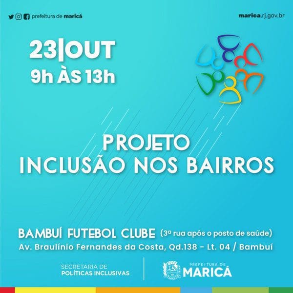 A Prefeitura de Maricá, por meio da Secretaria de Políticas Inclusivas, promoverá neste sábado (23/10), das 9h às 13h, o projeto “Inclusão nos Bairros”. Com o tema “Eu te incluo, você me inclui”, o objetivo é levar os serviços públicos aos bairros.