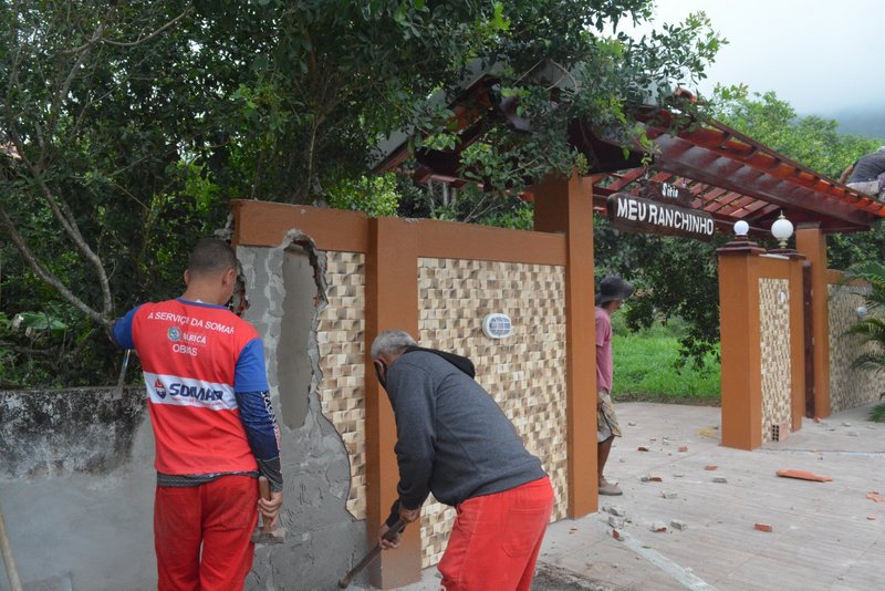 A Prefeitura de Maricá demoliu nesta quarta-feira (27/10) muros construídos irregularmente na Rua Nossa Senhora do Carmo (antiga Rua 19), na localidade Barroco, em Itaipuaçu. O proprietário do sítio “Meu Ranchinho” bloqueou a rua com muros e portão, impedindo a passagem das pessoas.