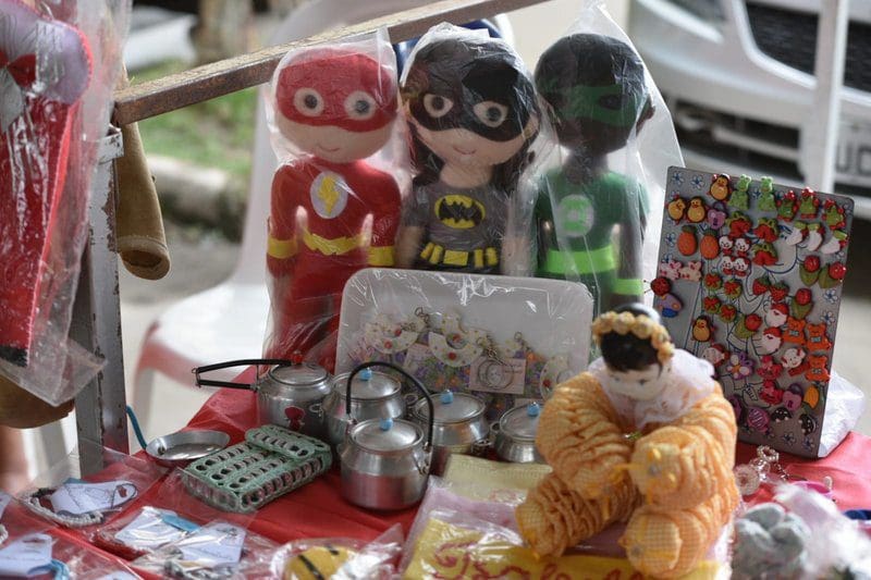 A feirante Francisca Alves, de 46 anos, vende capas para almofadas e leva sempre os filhos João Emanuel (de 7 anos) e Pedro Lucas (de 5 anos) para apresentarem suas criações artísticas no local, reforçando o papel da criatividade no cotidiano das crianças.