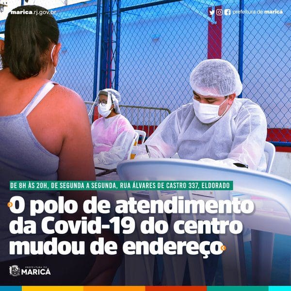 A partir deste domingo (31/10), o polo exclusivo para atendimentos de casos suspeitos da Covid-19, que funcionava na área externa do Esporte Clube Maricá, passa a atender em outro local. O novo endereço fica na Rua Álvares de Castro 337, no bairro Eldorado, próximo à sede da Prefeitura. O polo mantém o horário de funcionamento de 8h as 20h e vai permanecer de segunda a segunda-feira.