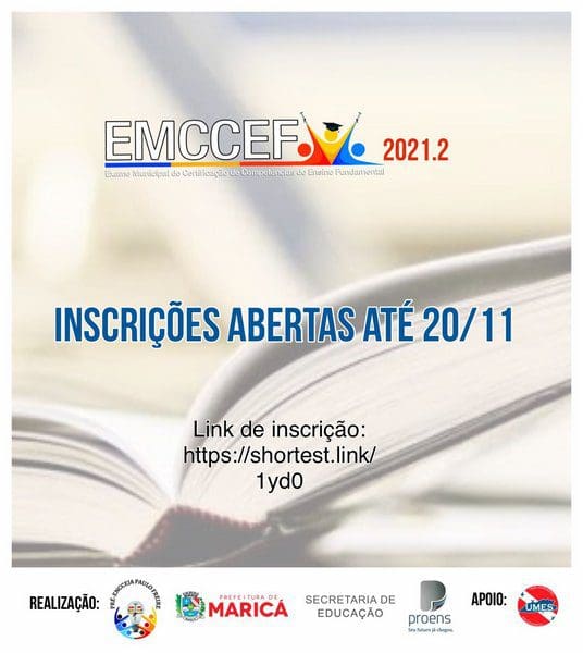 A Prefeitura de Maricá abriu inscrições para a edição segundo semestre de 2021 do preparatório para o Exame Municipal de Certificação de Competências do Ensino Fundamental (EMCCEF). O curso é destinado aos moradores de Maricá a partir dos 15 anos  que são alunos da rede municipal de ensino e adultos de qualquer idade que não concluíram o ensino fundamental.