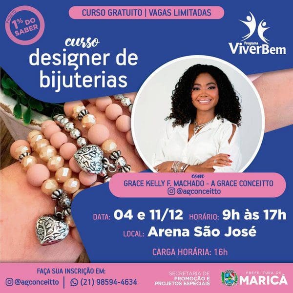 A Prefeitura de Maricá, por meio da Secretaria de Promoção e Projetos Especiais, disponibiliza 30 vagas do curso de designer de bijuterias aos moradores da cidade. A iniciativa é gratuita e será realizada nos dias 4 e 11 de dezembro, na Arena São José. As aulas acontecem das 9h às 17h, totalizando 16 horas/aula e serão ministradas pela designer de bijuterias Grace Kelly.