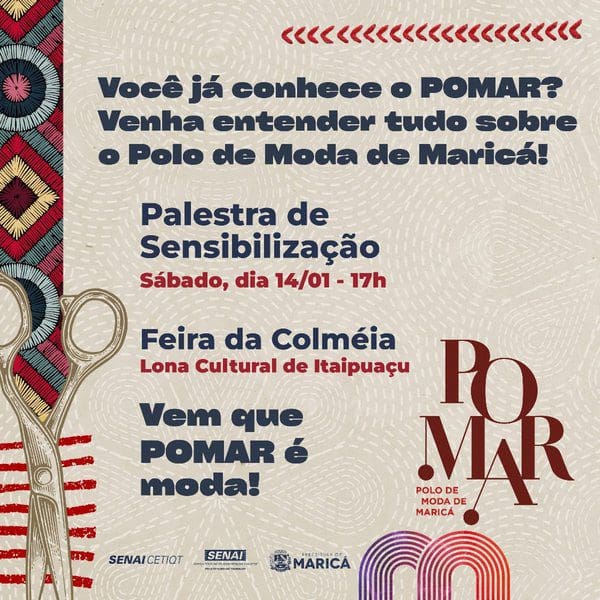 A Prefeitura de Maricá realiza neste sábado (14/01), às 17h, uma palestra de sensibilização do Polo de Moda de Maricá (Pomar), na Feira da Colmeia, na Lona Cultural de Itaipuaçu. O evento tem o objetivo de identificar trabalhadores do mundo da moda que possam participar do Pomar, que visa a criação de um Arranjo Produtivo Local (APL) na cidade, com previsão de início neste semestre.