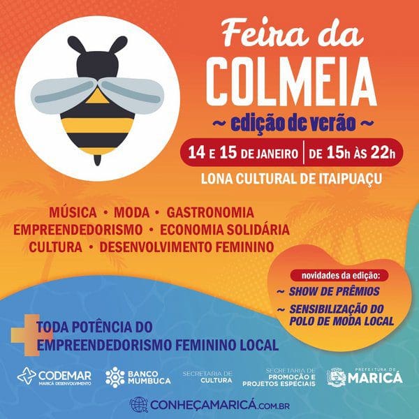 A primeira edição da Feira da Colmeia de 2023 acontece no próximo final de semana, sábado e domingo (14 e 15/12), das 15h às 22h, na Lona Cultural de Itaipuaçu. Com o tema “Verão”, a programação vai contar com mais de 80 expositores de produtos de gastronomia, artesanato e moda.