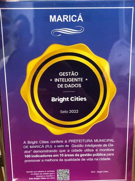 Maricá recebeu nesta sexta-feira (13/01) o Selo 2022 de Gestão Inteligente de Dados da Bright Cities, por ser uma cidade que utiliza e monitora 160 indicadores em 10 áreas da gestão pública, buscando promover a melhora da qualidade de vida dos moradores. A entrega aconteceu no gabinete do prefeito Fabiano Horta com a participação do secretário de Planejamento, Orçamento e Fazenda, Leonardo Alves; do subsecretário de Tecnologia da Informação (TI), Vitor Silveira; e do representante da empresa de consultoria, Fernando José Brandão.
