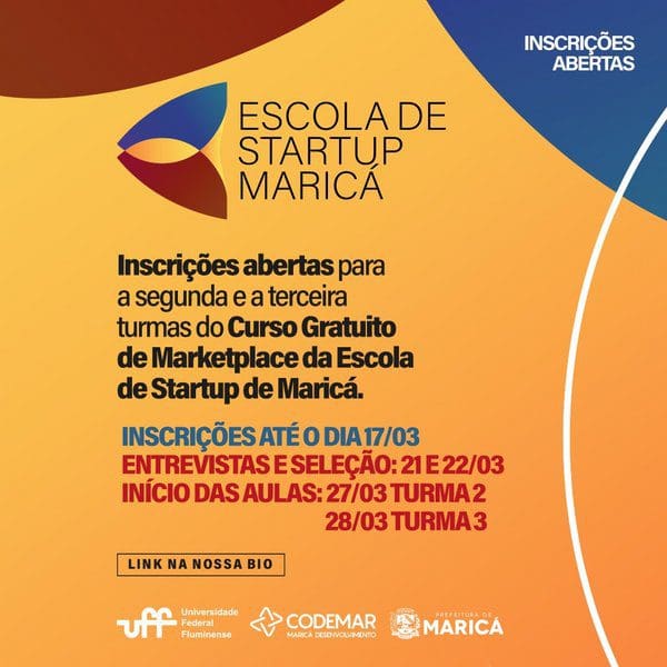Estão abertas as inscrições para a pré-matrícula dos alunos da segunda e terceira turmas do curso de marketplace da Escola de Startup de Maricá, que vai capacitar empreendedores e comerciantes da cidade para atuarem com plataformas digitais. Os interessados poderão preencher o formulário através do link escoladestartupmarica.com.br/cursos até dia 17/03. Essa é uma iniciativa da Prefeitura de Maricá e Codemar (Companhia de Desenvolvimento de Maricá), em parceria com a Universidade Federal Fluminense (UFF).