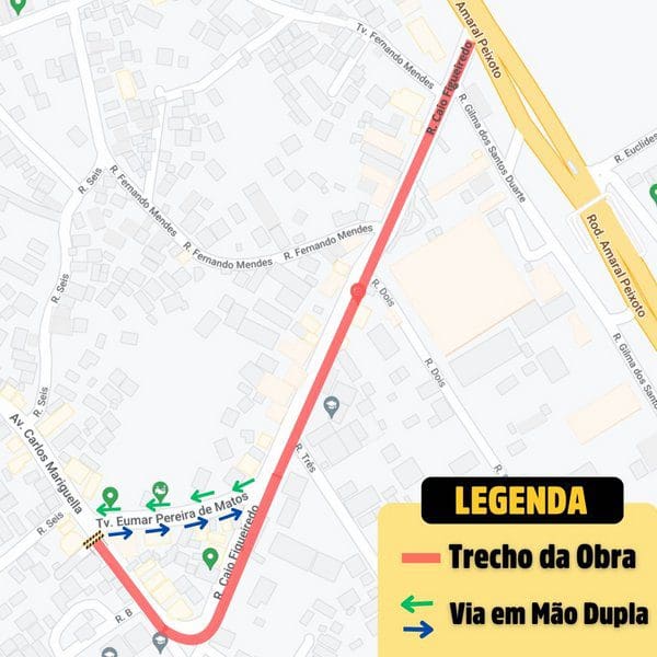 A via, que tem sentido único para Itaipuaçu, seguirá em mão dupla nesse primeiro momento em que as obras acontecem num trecho paralelo à ela. Após o avanço das obras, que deve acontecer na quarta-feira (12/04), a Travessa Eumar Pereira voltará ao sentido único normal e a Rua Caio Figueiredo passará a funcionar com sistema de pare e siga até a conclusão da intervenção, prevista para o sábado (15/04).