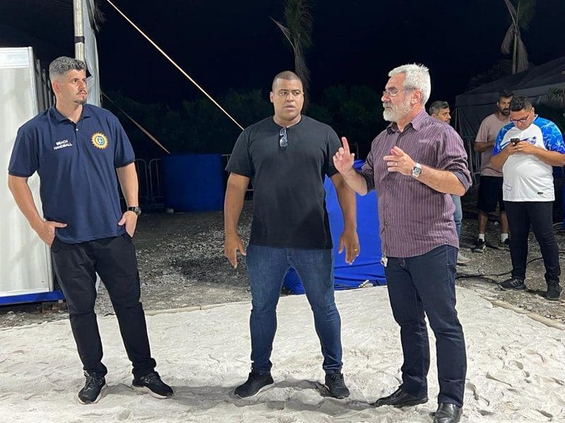 A arena que comportará a 1ª etapa do Circuito Brasileiro de Handebol de Praia de 2023, entre os dias 20 e 23/04; e a 1ª etapa do Global Tour Beach Handball – torneio da Federação Internacional de Handebol (IHF) -, entre os dias 26 e 30/04, recebeu a visita nesta quarta-feira (19), do prefeito de Maricá, Fabiano Horta e do presidente da Codemar, Hamilton Lacerda.