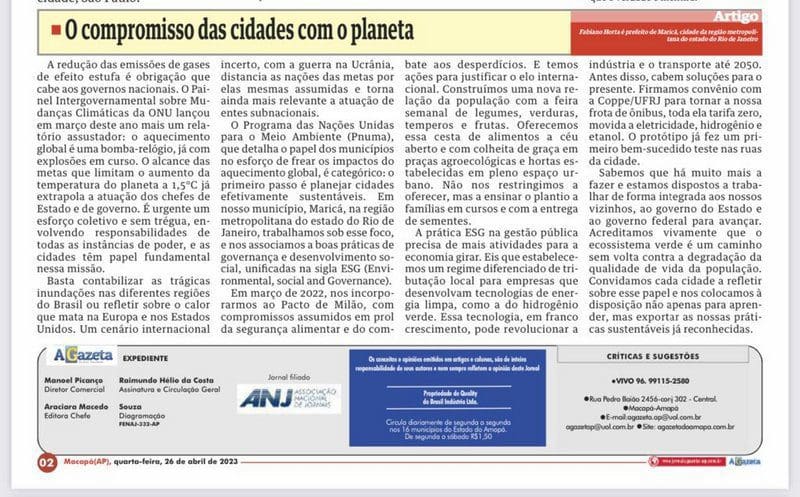A gestão de Maricá foi destaque mais uma vez na imprensa nacional. A Gazeta do Amapá, maior jornal do Estado, publicou nesta quarta-feira (26/04) o artigo “O compromisso das cidades com o planeta” onde o prefeito Fabiano Horta aborda as boas práticas de governança e de desenvolvimento social, unificadas na sigla ESG (Environmental, social and Governance), de vital importância de gestores do país e no mundo. Fabiano citou o Pacto de Milão, no qual Maricá integra desde março de 2022, com as iniciativas de segurança alimentar e de combate ao desperdício.