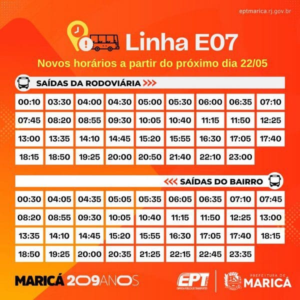 A Prefeitura de Maricá, por meio da Empresa Pública de Transportes (EPT), informa que a partir da próxima segunda-feira (22/05), os usuários da linha E07 (Centro X Caxito via Alecrim) passarão a contar com horários otimizados e 35 viagens diariamente.
