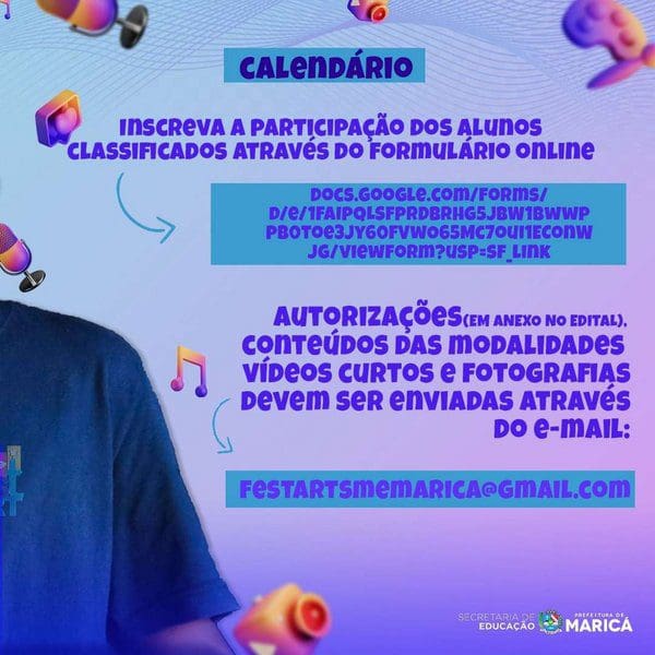 A Prefeitura de Maricá, por meio da Secretaria de Educação, segue até o dia 04/08 com inscrições para a fase distrital do 4º Festival Estudantil de Artes de Maricá (Festart). O procedimento deve ser feito pelo formulário online: https://encurtador.com.br/inqyD com os estudantes classificados em primeiro lugar por modalidade/categoria (faixa etária).