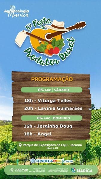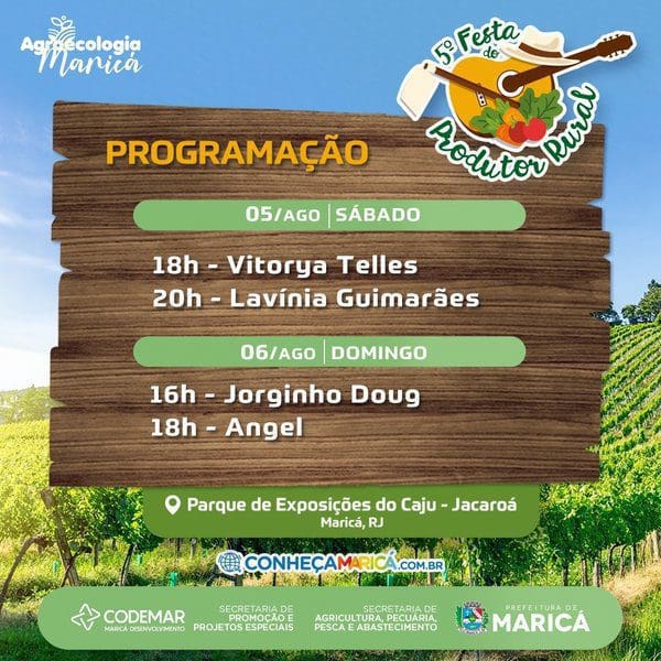 A Prefeitura de Maricá, por meio da Secretaria de Agricultura, Pecuária, Pesca e Abastecimento vai promover no próximo fim de semana (05 e 06/08), a partir das 09h, a 5ª Festa do Produtor Rural. O evento acontece no Parque de Exposições do Caju, localizado na Rua Luiz Fernando dos Santos Caetano, Caju, e tem em sua programação palestras, oficinas, shows, feira de agricultura familiar, gastronomia, bebidas artesanais, distribuição de mudas e sementes agroecológicas e até uma feira para adoção de cães. A entrada é franca.