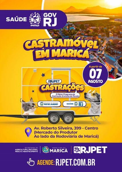 A Prefeitura de Maricá, por meio da Secretaria de Agricultura, Pecuária, Pesca e Abastecimento, vai disponibilizar a partir desta segunda-feira (07/08) o serviço de castração de cães e gatos, através do ônibus “Castramóvel”, que vai atender ao longo de todo este mês em dois pontos diferentes da cidade. De 07 a 18 de agosto, o veículo estará no pátio do Mercado do Produtor, na Avenida Roberto Silveira, seguindo para a Sede Distrital da Prefeitura em Itaipuaçu entre os dias 19 de agosto e 1º de setembro. O atendimento será no horário das 8h às 17h.