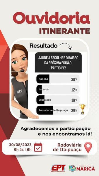 A Prefeitura de Maricá, por meio da Empresa Pública de Transportes (EPT), realiza nesta quarta-feira (30/08) mais uma edição especial do projeto “Ouvidoria Itinerante”. O atendimento presencial aos usuários dos ônibus Tarifa Zero e das bicicletas vermelhinhas acontece das 9h às 16h, no Terminal Rodoviário de Itaipuaçu, localizado na Rua Professor Cardoso de Menezes (antiga Rua 1), entre a Ruas 33 e a Rua Van Lerbergue (antiga Rua 34).