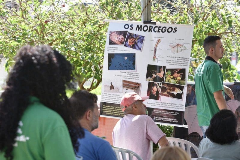 Outra atração foi uma palestra do projeto Morcegos na Praça, do Laboratório de Atrópodes Parasitas da Universidade Federal Rural do Rio de Janeiro (UFRRJ). O intuito era desmistificar o medo das pessoas sobre esses mamíferos e informar, inclusive, que existem leis de proteção para eles, mas também prevenir possíveis acidentes e transmissões de doenças.