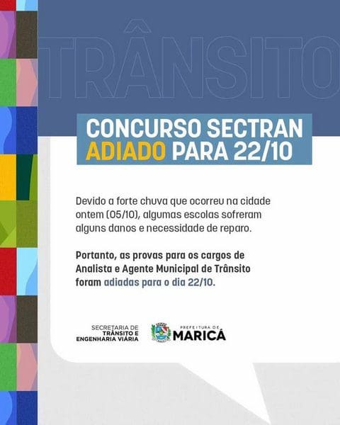 A Prefeitura de Maricá informa que a Comissão Especial de Fiscalização e Acompanhamento dos Concursos Públicos e a Coordenação de Seleção Acadêmica da Universidade Federal Fluminense (COSEAC-UFF,) decidiram pelo adiamento da prova objetiva do concurso público da Engenharia Viária (Sectran). A prova aconteceria neste domingo (08/10) e a nova data será divulgada em breve.