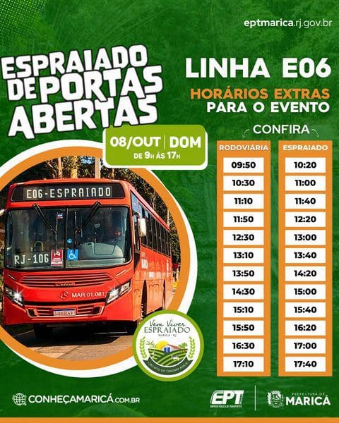 A Empresa Pública de Transportes (EPT) vai disponibilizar horários extras dos vermelhinhos para a linha E-06 (Centro X Espraiado), das 9h às 17h de domingo (09/04), para facilitar o acesso de moradores e visitantes ao evento. Além da programação normal, haverá mais 12 horários extras com saídas da Rodoviária do Povo (Centro) e do ponto final no bairro do Espraiado com destino ao Centro da Cidade.