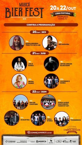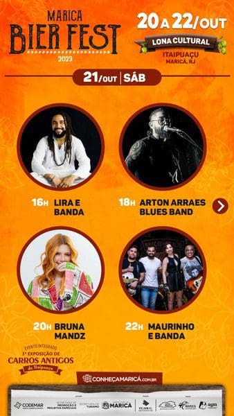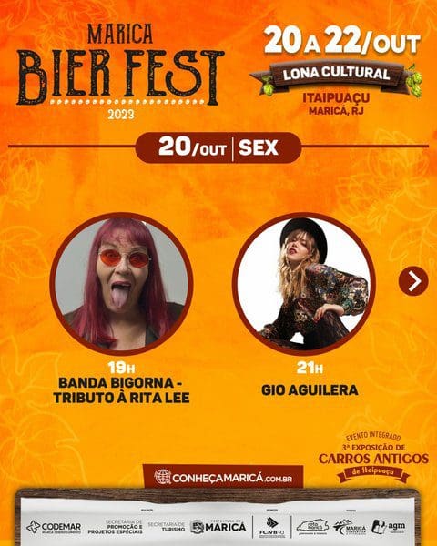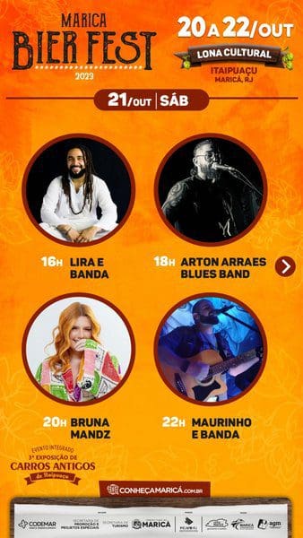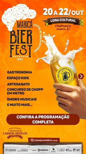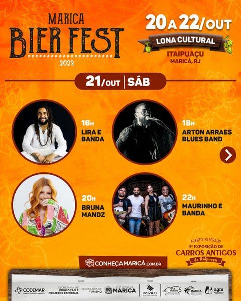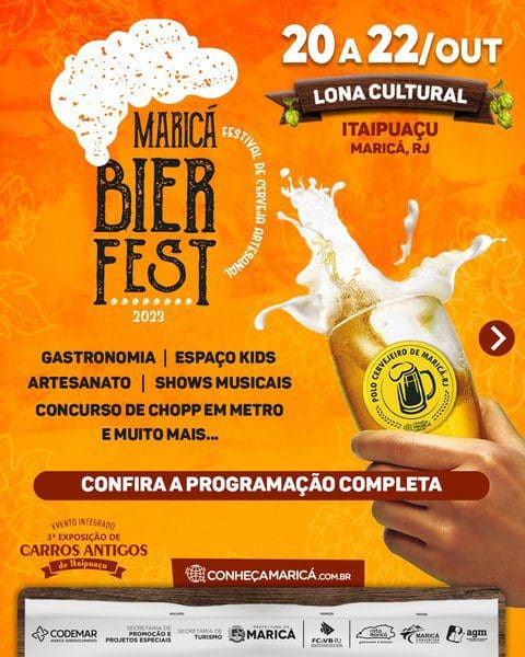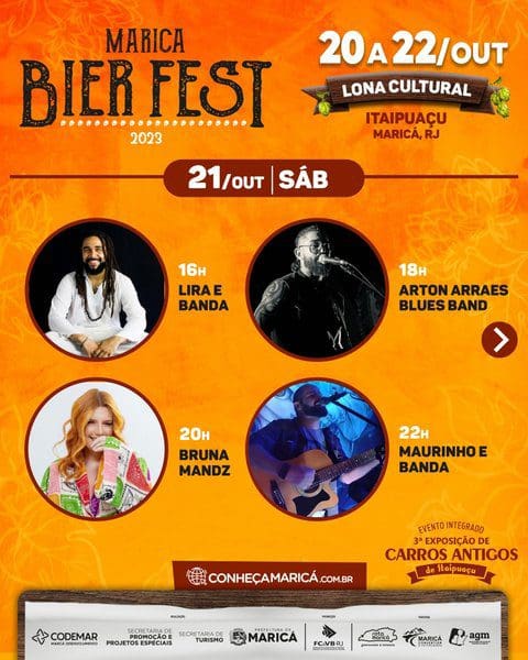 A Prefeitura de Maricá realiza neste fim de semana três eventos integrados em Itaipuaçu. O Maricá Bier Fest 2023, o Festival Rua & Sabor e a Exposição de Carros Antigos de Itaipuaçu. Os dois primeiros ocupam a lona cultural da Praça dos Gaviões da sexta-feira (20) até domingo (22/10), com gastronomia variada e o polo cervejeiro de Maricá. Dois palcos simultâneos começam a funcionar no sábado (21/10), quando começa o Rua & Sabor. Haverá shows de 13 artistas locais para animar o público.