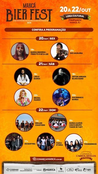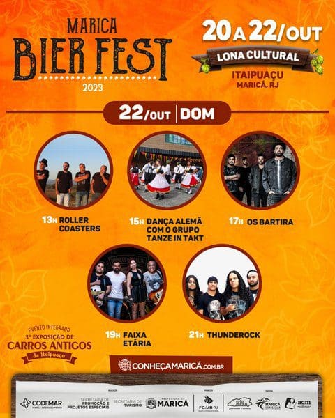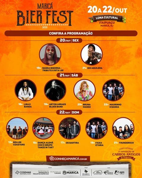 A Exposição de Carros Antigos de Itaipuaçu, que acontece no sábado (21/10, a partir das 12h) e no domingo (22/10, a partir das 9h), traz um toque nostálgico e uma oportunidade para os amantes de carros admirarem modelos clássicos deslumbrantes. O Maricá Bier Fest 2023 e o Festival Rua & Sabor acontecem a partir das 14 horas nos três dias (20, 21 e 22 de outubro). A realização é da Companhia de Desenvolvimento de Maricá (Codemar) e das secretarias de Turismo e de Promoção e Projetos Especiais.