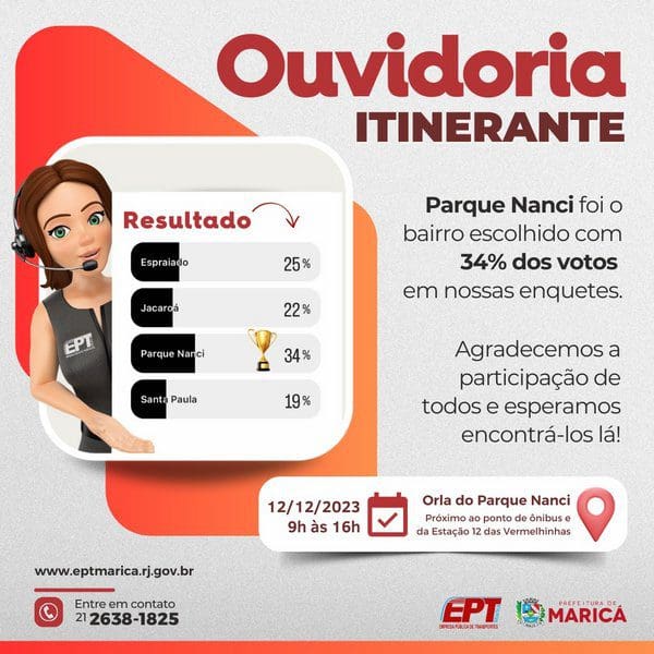 A Prefeitura de Maricá, por meio da Empresa Pública de Transportes (EPT), realiza nesta terça-feira (12/12) mais uma edição especial do projeto “Ouvidoria Itinerante”. O atendimento presencial aos usuários dos ônibus chamados popularmente de “vermelhinhos”, principal transporte público da cidade, e das “vermelhinhas”, as bicicletas populares, acontece das 9h às 16h, próximo ao ponto de ônibus e à estação 12 das bicicletas vermelhinhas.