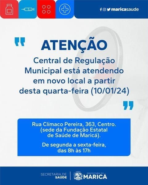 A Prefeitura de Maricá, por meio da Secretaria de Saúde, informa que a Central de Regulação do município está funcionando temporariamente na sede da Fundação Estatal de Saúde (Femar), localizada na Rua Clímaco Pereira, 363, no Centro. O atendimento ocorre de segunda a sexta-feira, das 8h às 17h. A mudança segue até a finalização das adequações do novo local do serviço, que ficava no edifício Maricá Center da Rodovia Amaral Peixoto (RJ-106), no bairro Parque da Cidade.