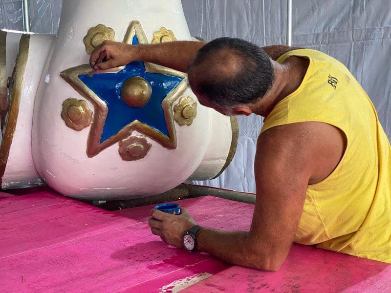No barracão, em Itapeba, o diretor de Carnaval, Moreira Maia, de 68 anos, organiza a equipe que prepara os carros alegóricos e informou que, na próxima semana, será feito o acabamento dos veículos.
