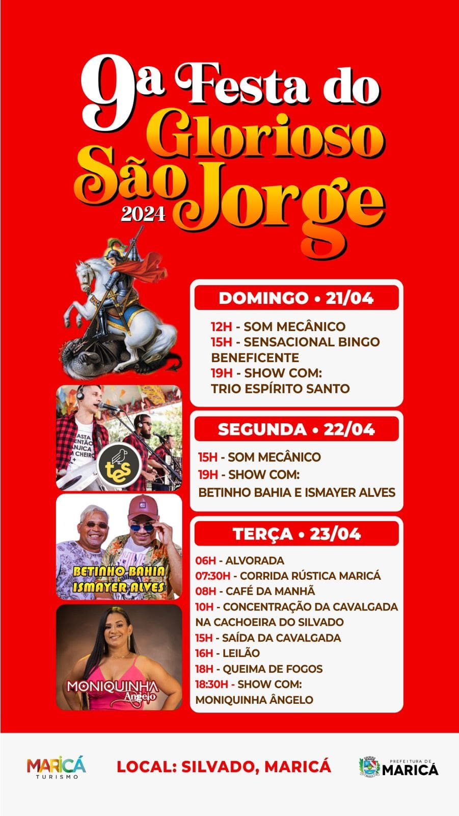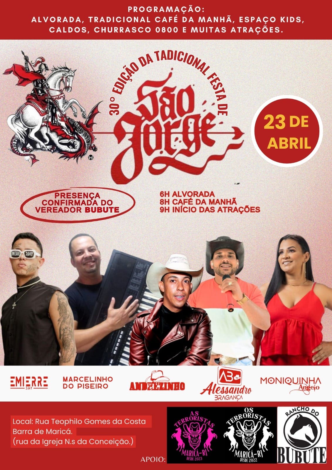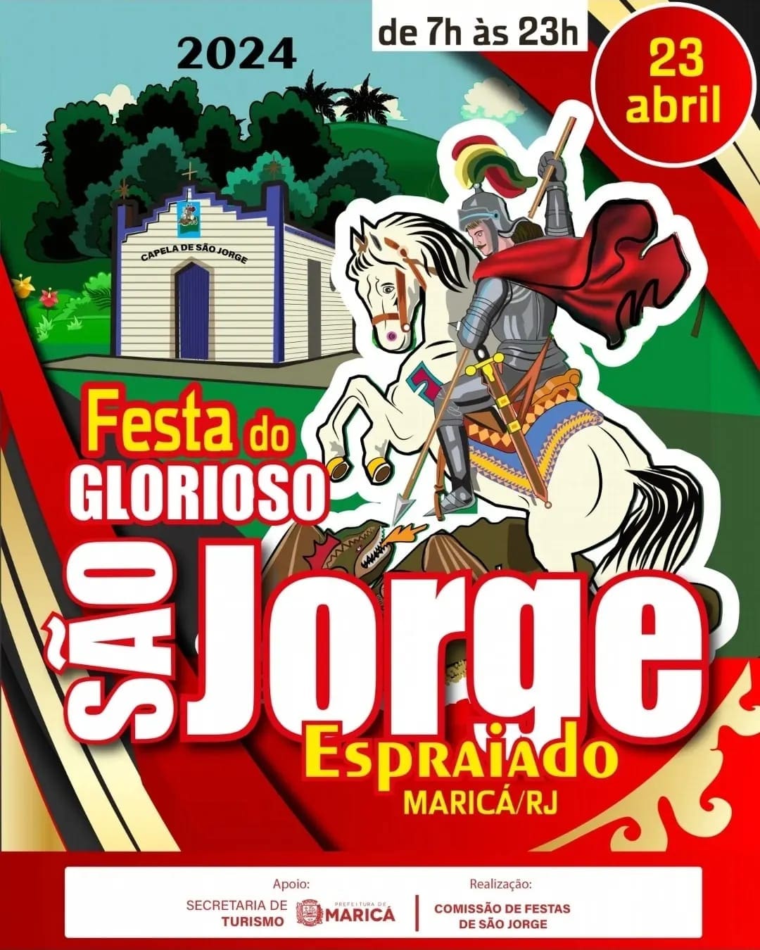 O dia de São Jorge, um dos santos de maior devoção do país, terá três locais de festividades em Maricá na próxima terça-feira (23/04), quando o ‘santo guerreiro’ é celebrado. Além da tradicional cavalgada no Espraiado, haverá ainda festa nos bairros do Silvado e da Barra de Maricá, todos com atrações como bingos, leilões, atos religiosos, shows de artistas locais e até uma corrida rústica. Os eventos contam com apoio da Prefeitura de Maricá, por meio da Secretaria de Turismo.