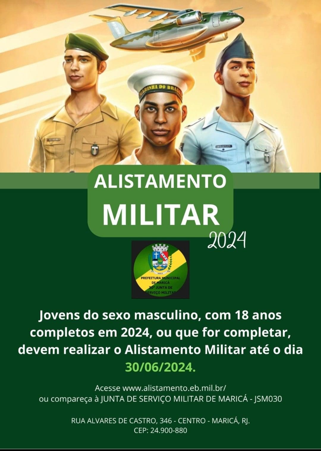 A 30ª Junta de Serviço Militar, que funciona no prédio-sede da Prefeitura de Maricá, no Centro, alerta aos jovens maricaenses do sexo masculino nascidos em 2006 e que, portanto, completam 18 anos em 2024, que o prazo para o alistamento militar obrigatório vai até o fim deste mês. Quem preferir se alistar de maneira presencial deve comparecer à junta de segunda a sexta-feira, das 9h às 17h, até o dia 28 de junho. Se o jovem optar pelo alistamento online poderá acessar o site: www.alistamento.eb.mil.br até o dia 30 de junho.