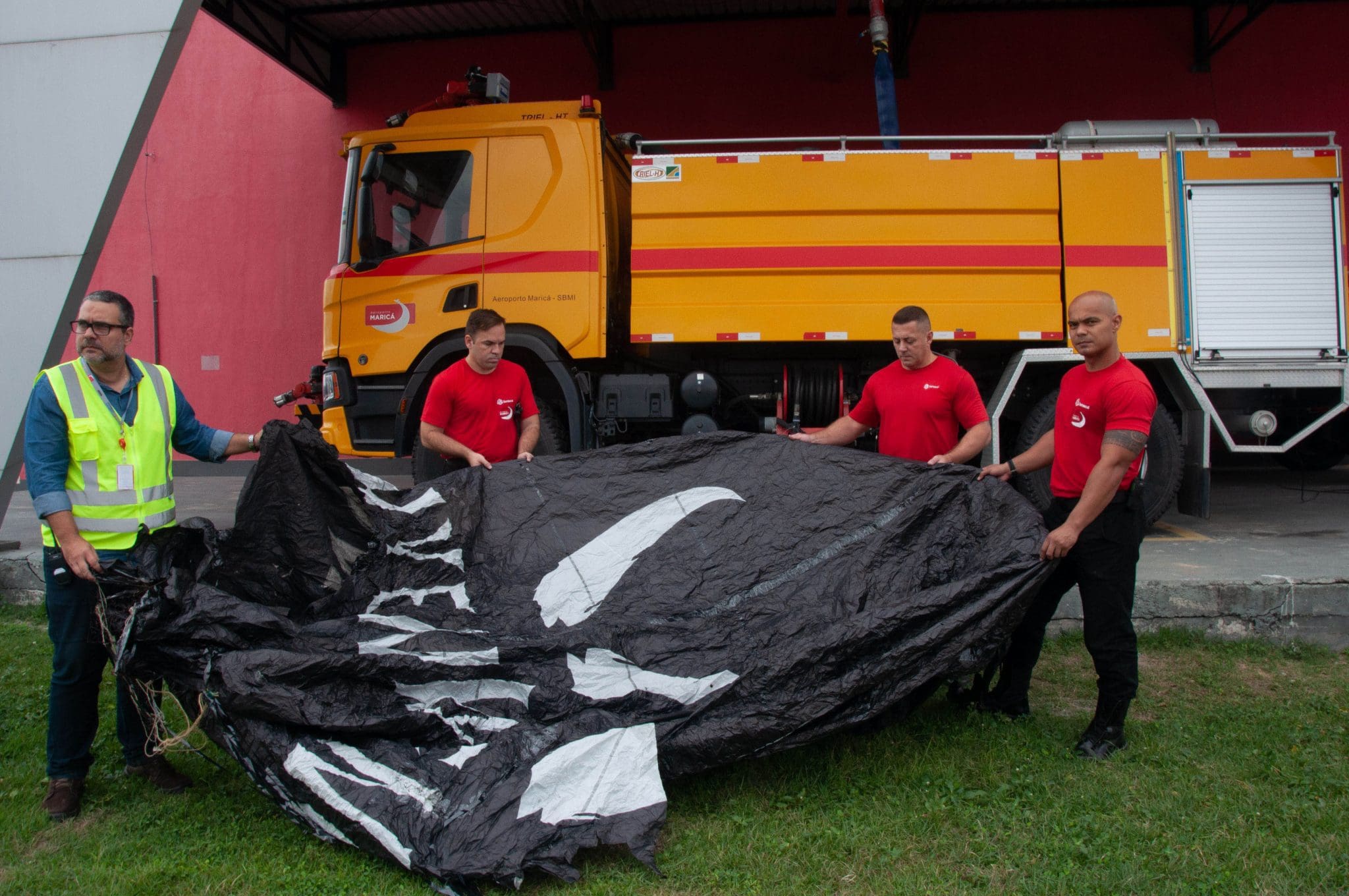 “Nós temos materiais altamente inflamáveis aqui no Aeroporto de Maricá, como 100 mil litros de combustível em nosso posto de abastecimento”, explica Frederico Ferreira, coordenador do sistema de Gerenciamento da Segurança Operacional (SGSO) da Companhia de Desenvolvimento de Maricá (Codemar).