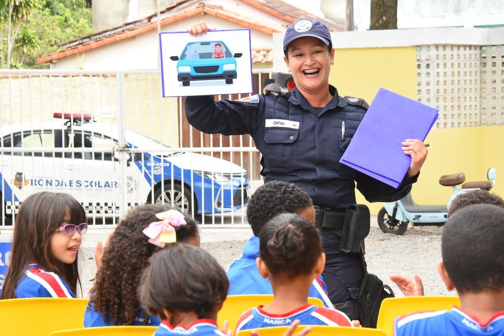 O Grupamento Ronda Escolar (GRE) da Guarda Municipal de Maricá, em parceria com a Secretaria de Educação, promoveu nesta sexta-feira (18/10) atividades lúdicas de trânsito na Escola Municipal Ademilda Muniz Simões (Tia Dedê), em São José do Imbassaí. Ao todo, 130 alunos do 1º ano participaram das ações e ouviram temas relevantes, como: cinto de segurança, capacete e sinalização de vias.