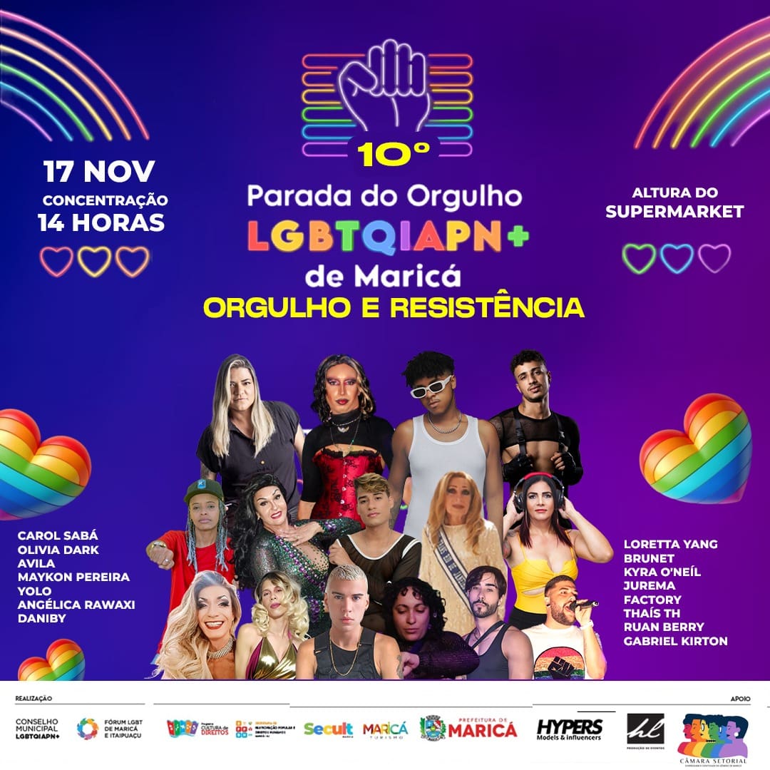 A Prefeitura de Maricá, por meio da Secretaria de Participação Popular e Direitos Humanos (SPPDH), promove neste domingo (17/11) a 10ª edição da Parada do Orgulho LGBTQIAPN+. Com o tema “Orgulho e Resistência”, uma extensa programação com diversas atrações e atos darão visibilidade à causa. Dois trios elétricos – um dedicado às lésbicas – contarão com DJs para agitar os presentes.