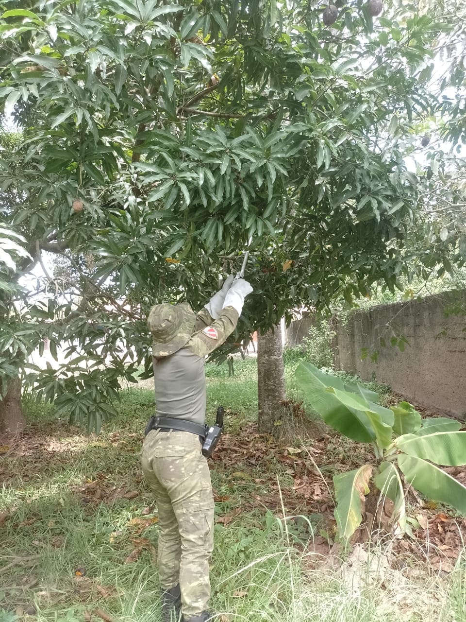 Réptil foi encontrado pendurado na árvore no quintal de uma residência e devolvido sem ferimentos ao seu habitat natural