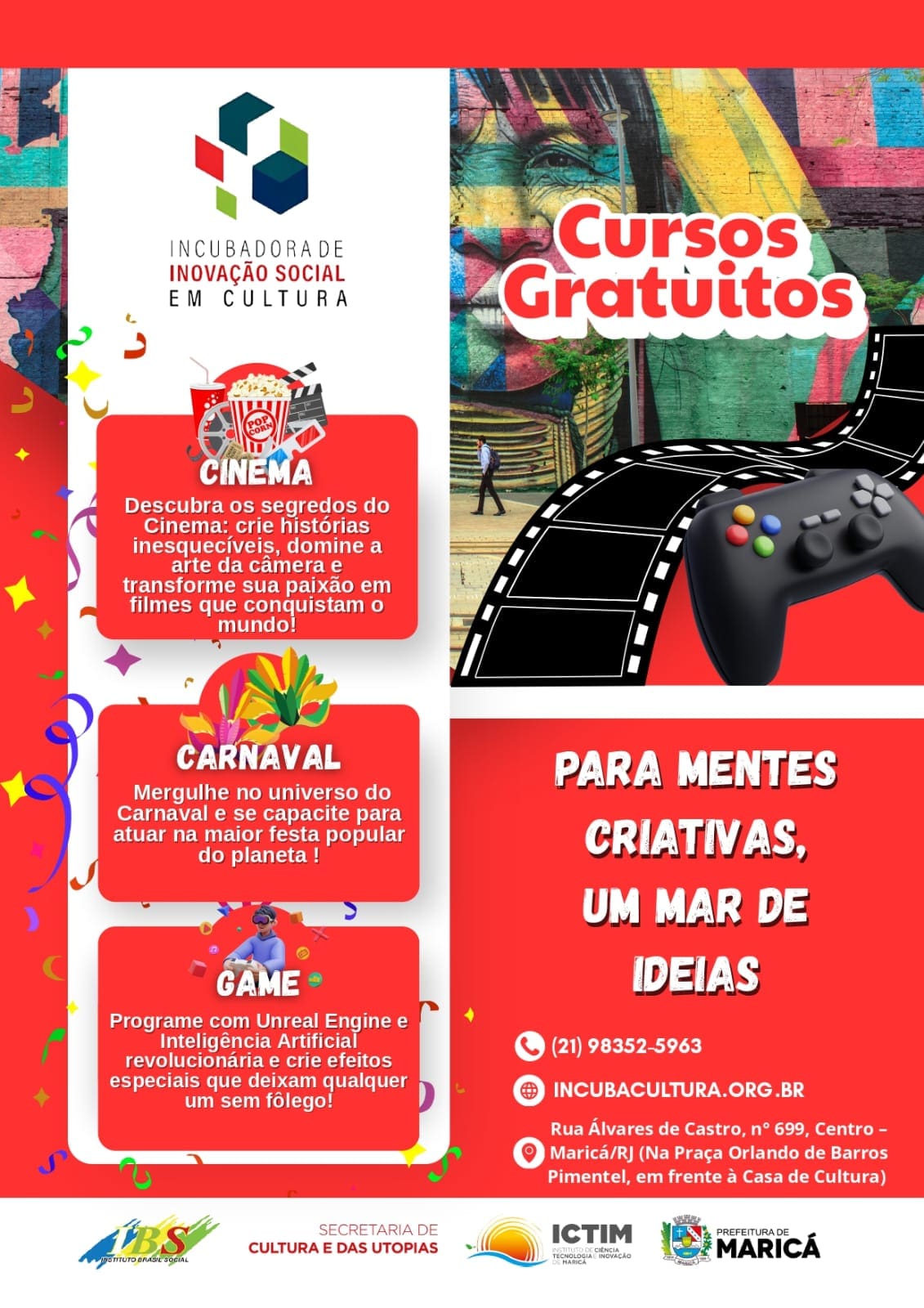 A Prefeitura de Maricá, por meio do Instituto de Ciência, Tecnologia e Inovação (ICTIM), abre na próxima segunda-feira (07/04) as inscrições para 26 cursos oferecidos pela Incubadora de Inovação Social em Cultura. O projeto – em parceria com a Secretaria de Cultura e das Utopias e com o Instituto Brasil Social (IBS) – oferta 629 vagas em qualificações nos eixos de Cinema, Game e Carnaval.