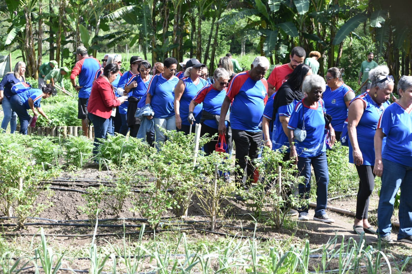 Após a visita guiada à plantação, o grupo partiu para a Escola Municipal do Espraiado, onde foi recebido com música ao vivo e almoço feito com os próprios ingredientes da região. Na escola, também, os idosos puderam receber mudas de alface, rabanete, capim-limão, coentro e tomilho, todas colhidas na fazenda.
